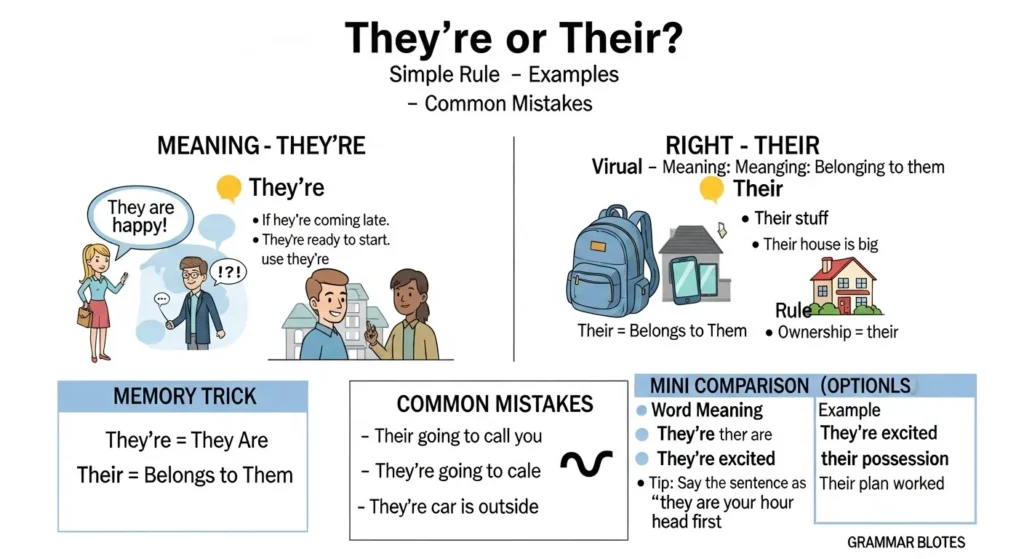 If “they are” works, I use they’re. If something belongs to someone, I use their. This tiny habit has saved me from countless errors in emails, articles, and messages. Mastering this difference doesn’t just fix grammar it improves clarity, credibility, and confidence in your writing.