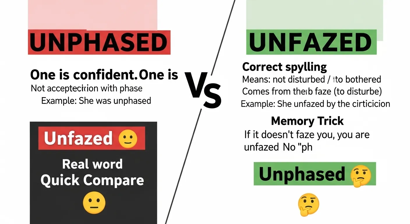 The confusion between unphased and unfazed is very common, but the answer is simple. Only unfazed is correct. The mistake happens because “phase” is a familiar word, and many people assume the spelling follows that pattern. However, the correct word comes from “faze,” which means to disturb. When you add “un-,” it becomes “unfazed,” meaning not disturbed.